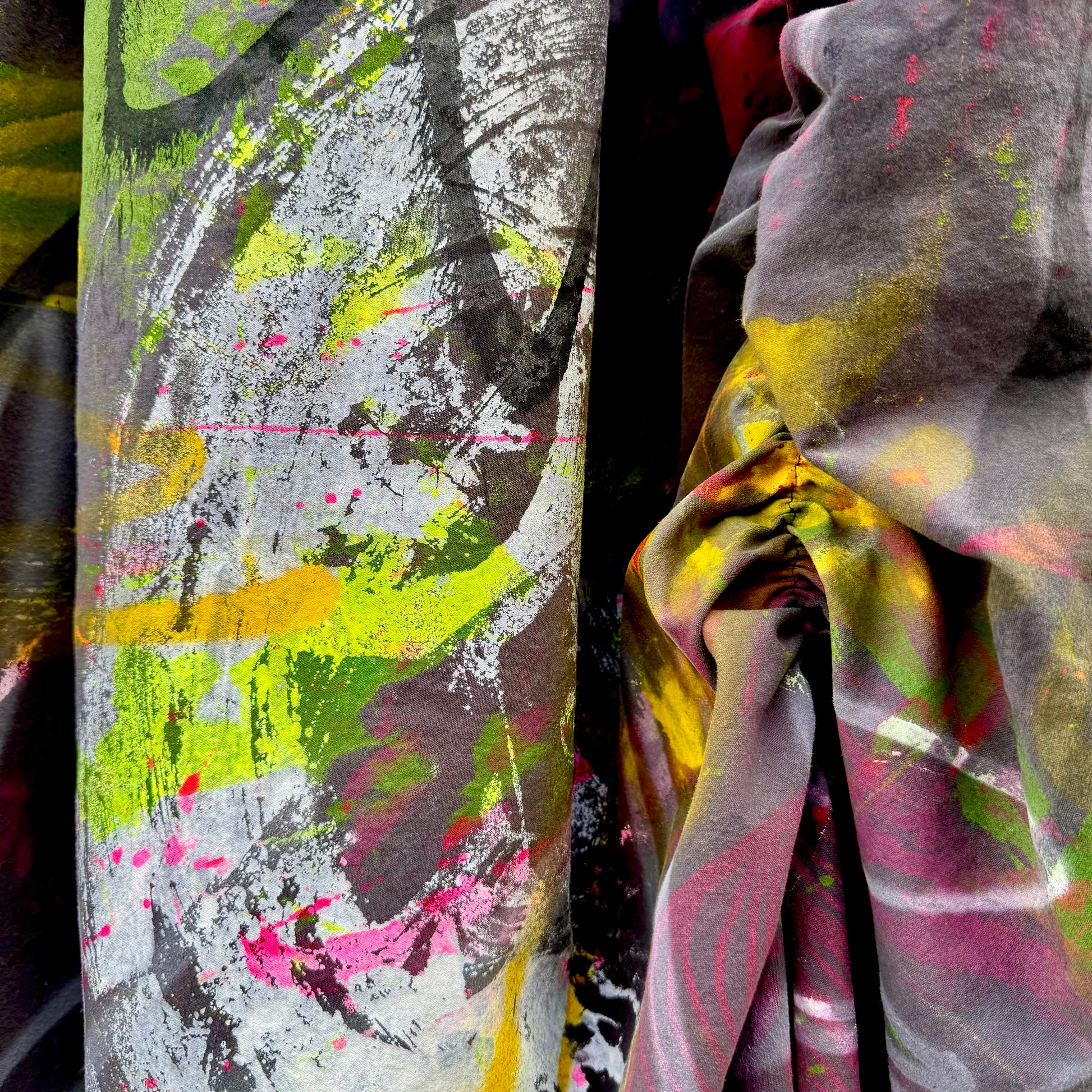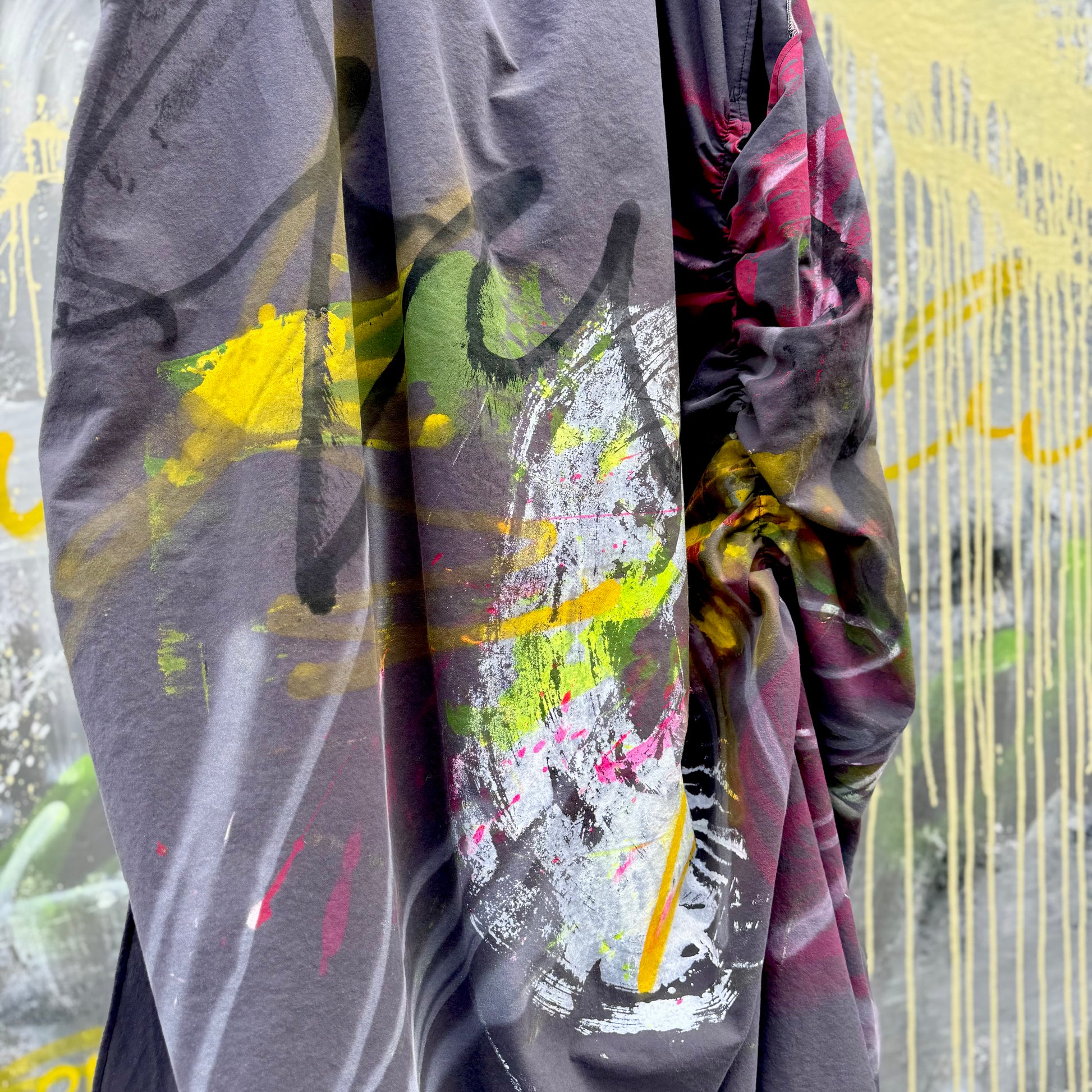 Let’s talk about this dress. It was the first piece I painted, I have an emotional connection to it and I hope you do to especially when you look at the amount of art on it and the amount of beautiful fabric I used. Then I used a technique of scrunching to give it structure and form. Wearable art