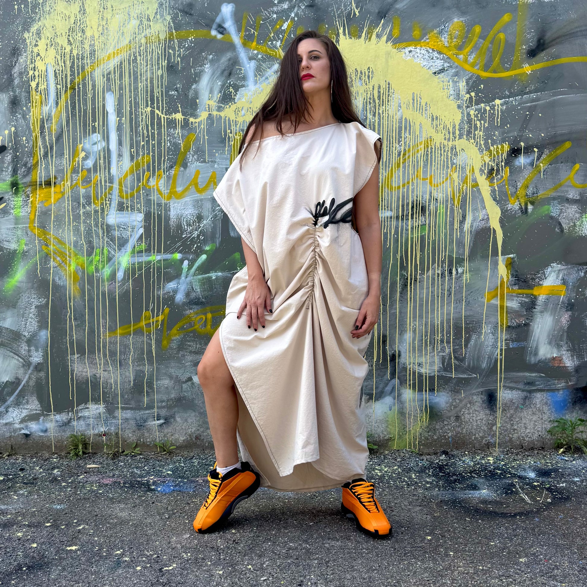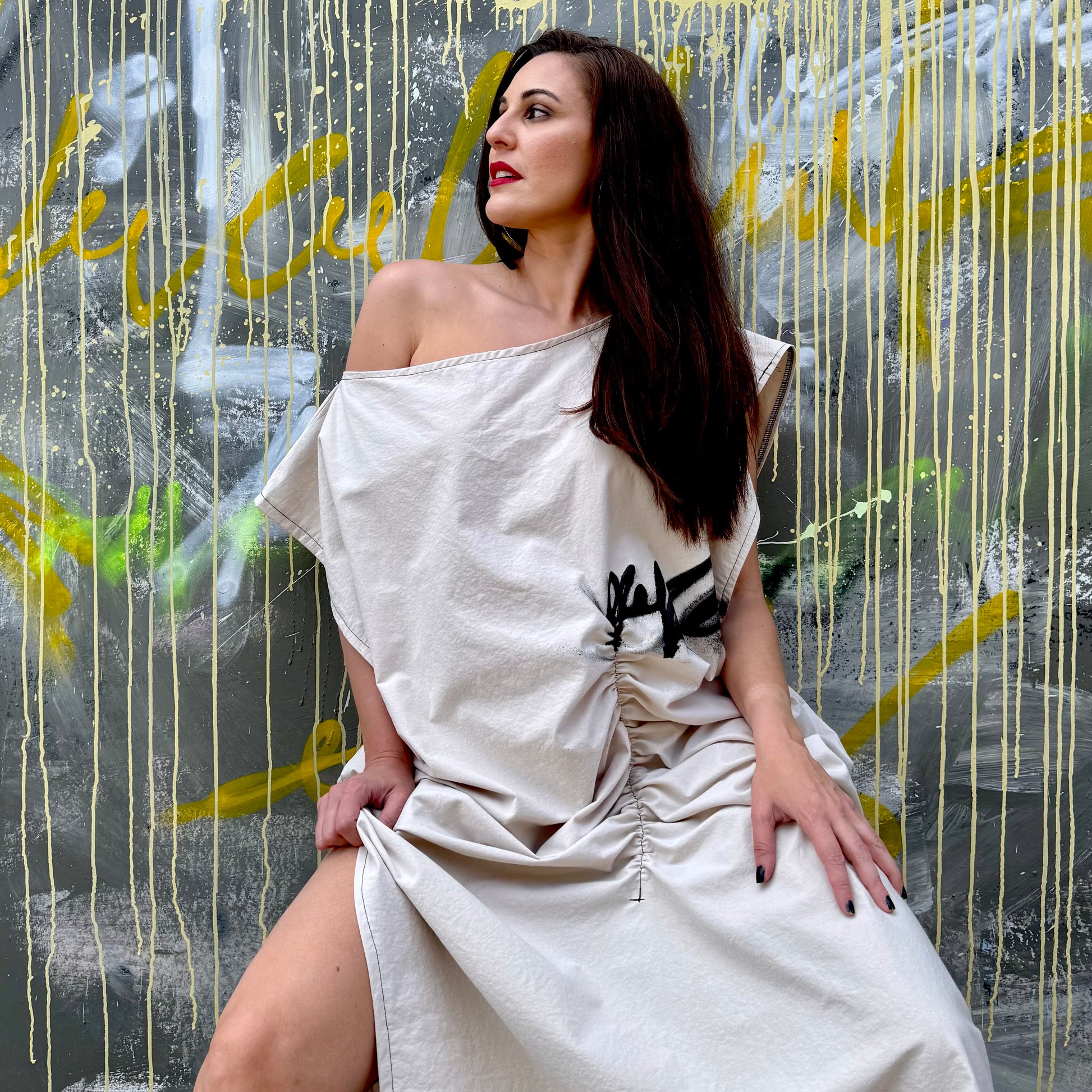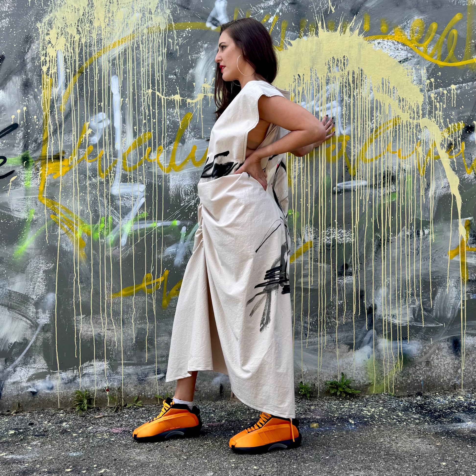 This collection is a true expression of wearable art - each dress is individually hand-painted and handmade, making every piece a one-of-a-kind AKA.ARTWEAR creation. Crafted from Japanese cotton, the fabric is soft, breathable and lightly structured for effortless everyday wear.