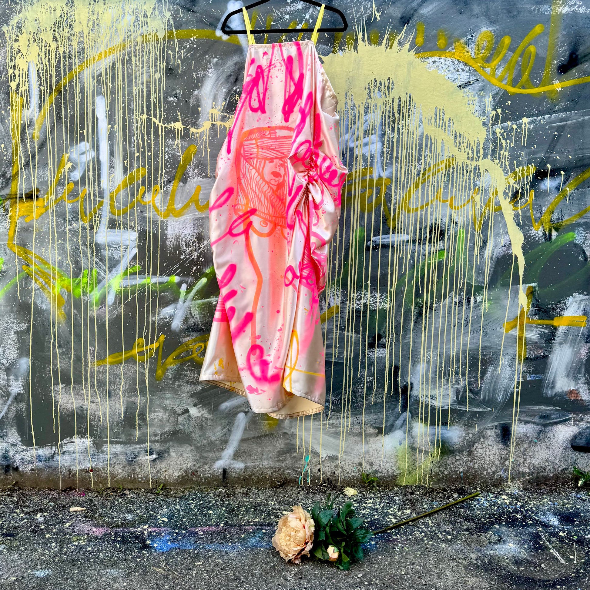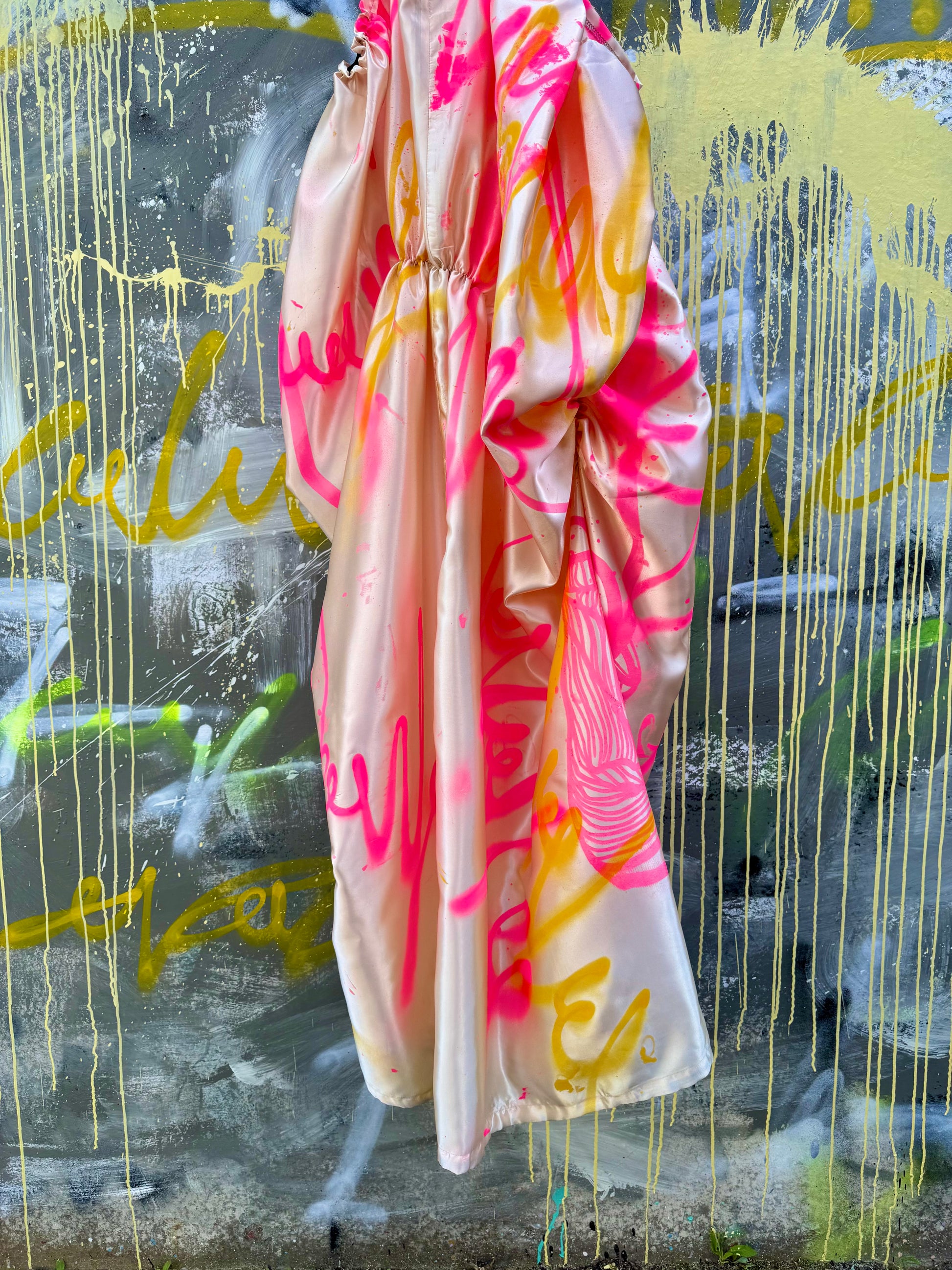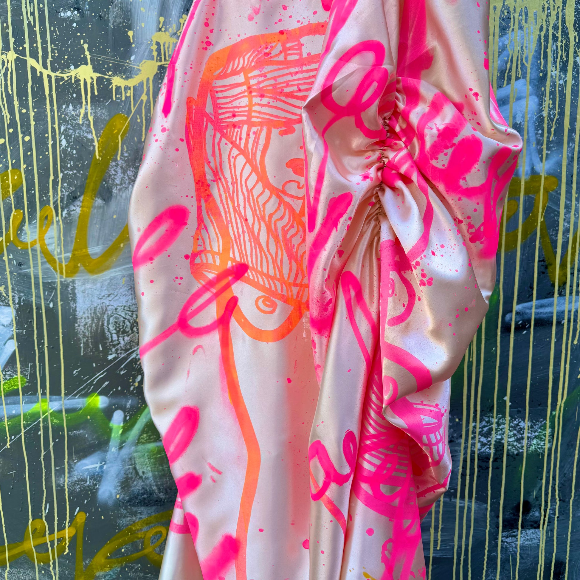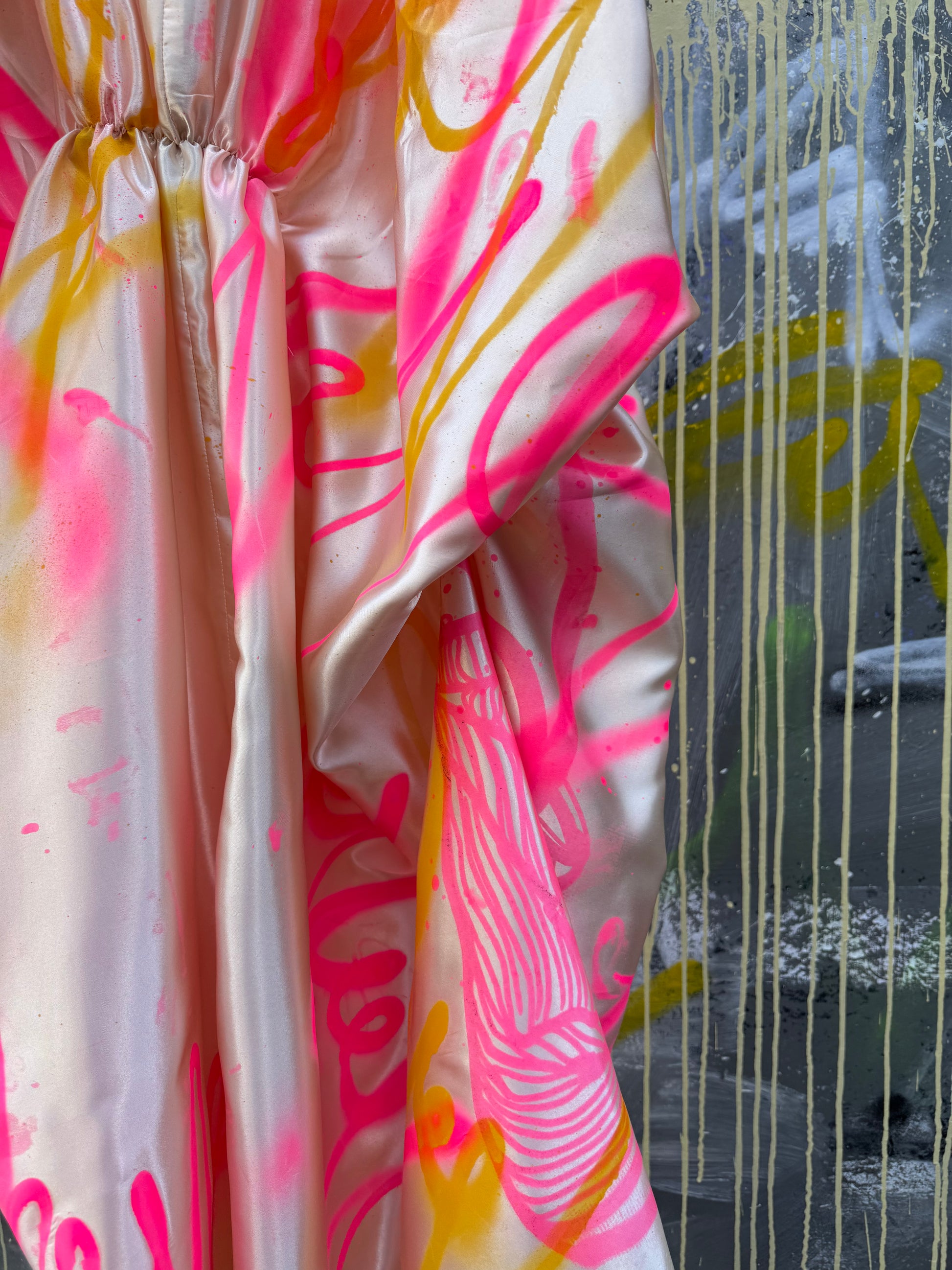 Silk/Satin painted dress in all the beautiful colours. Wear all day long. Love the design and is definitely one of a kind.