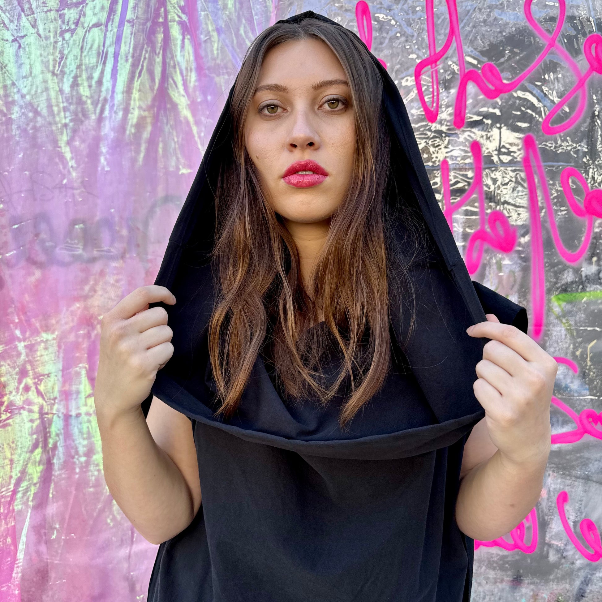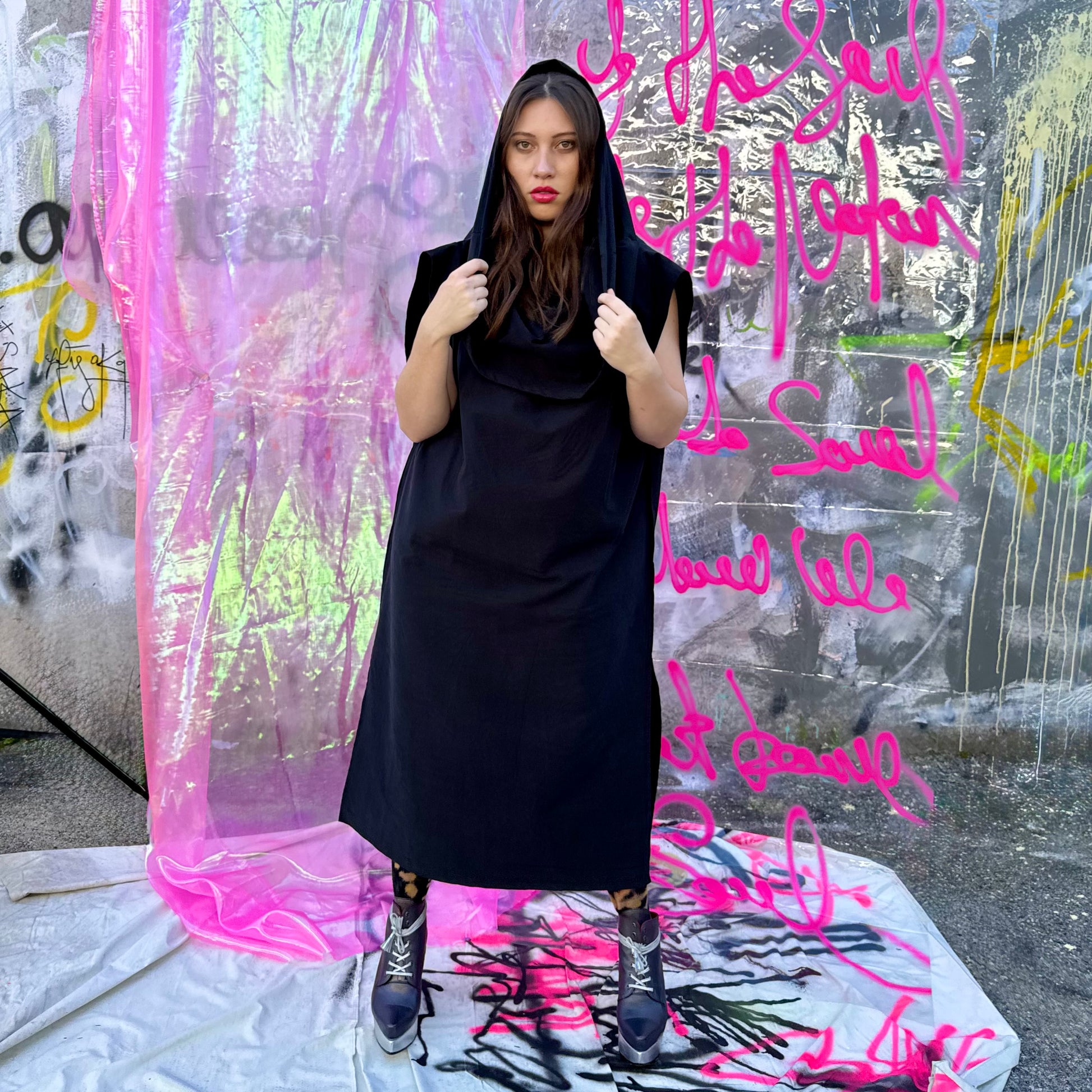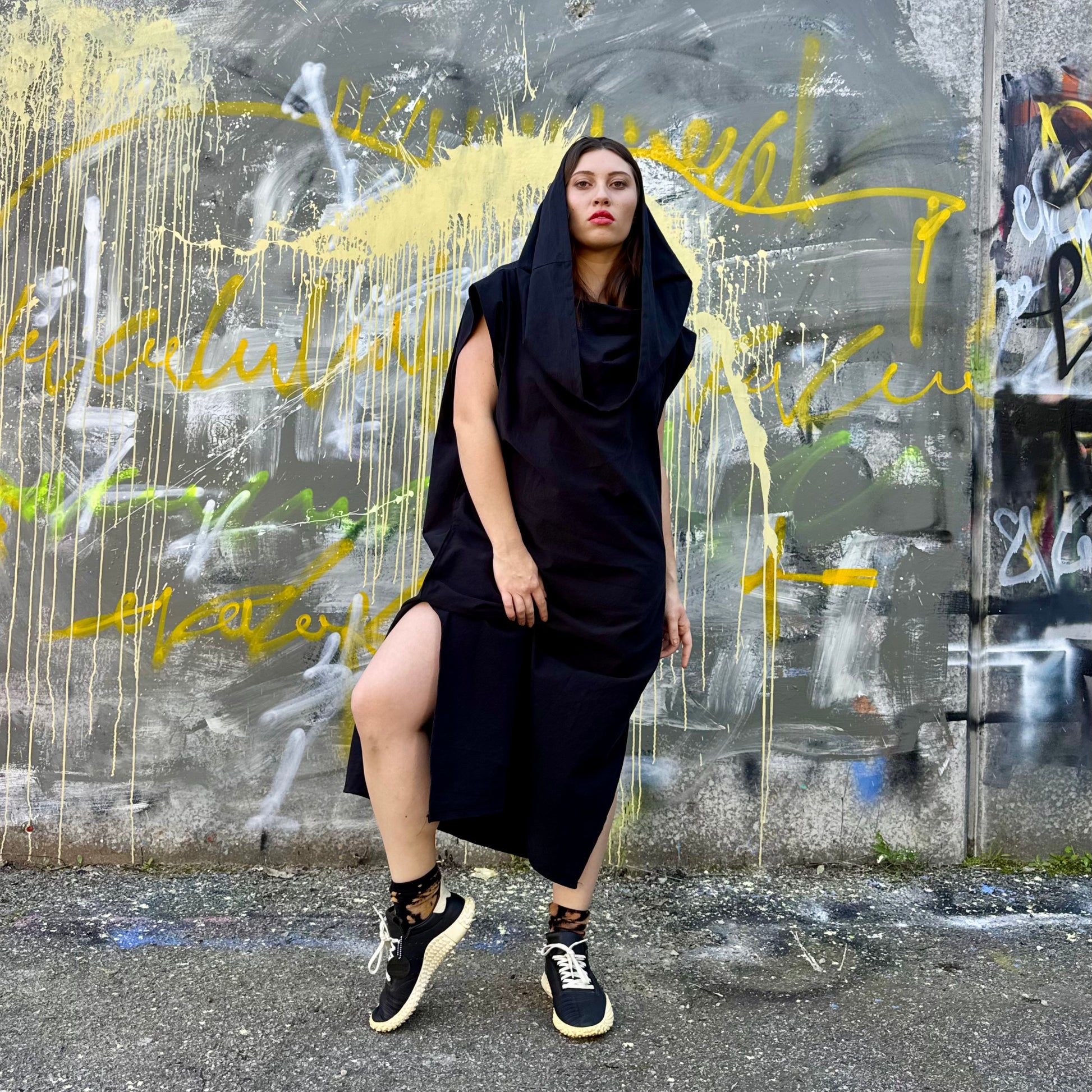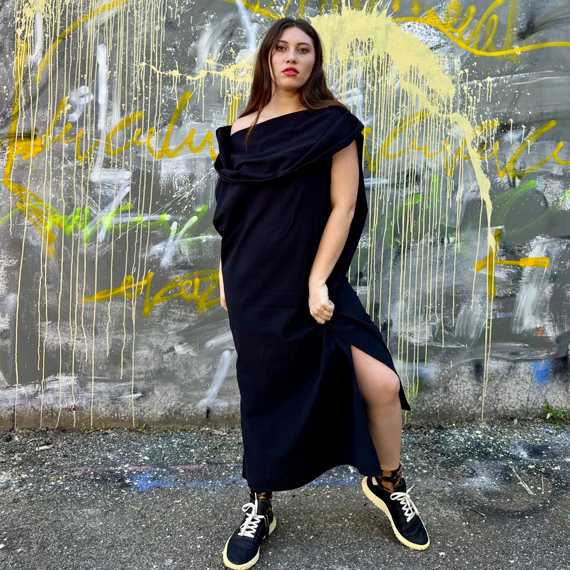 Black Japanese cotton big cowl neck dress is so versatile. Wear it up or adjust the shoulder line - very cool